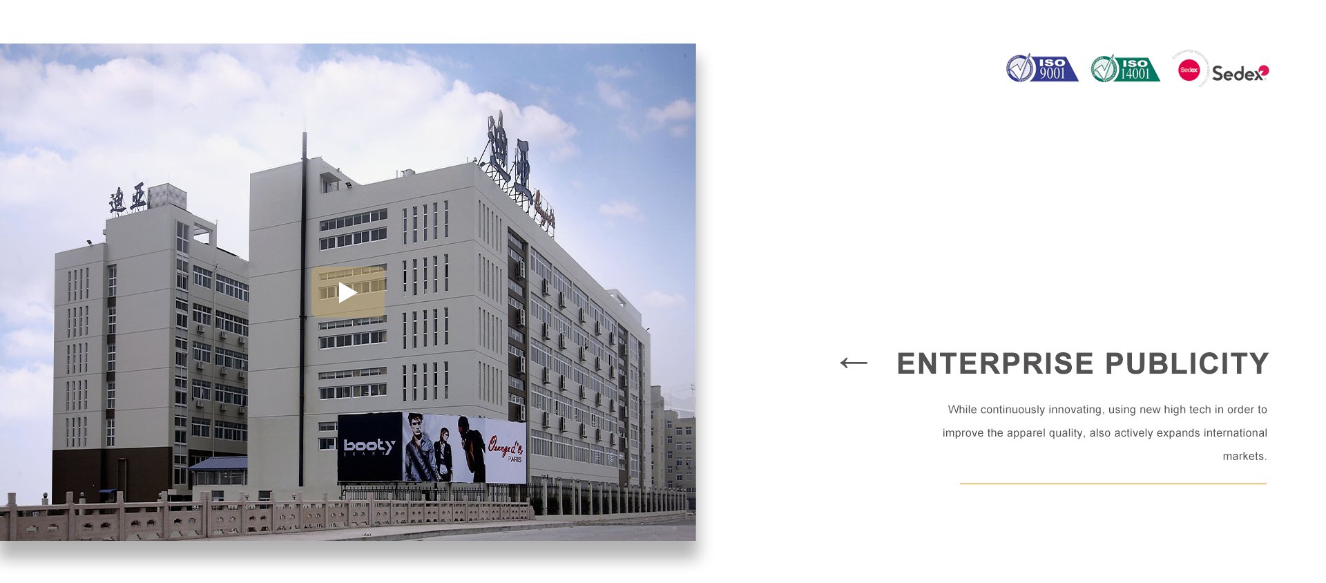 品牌建設(shè)是公司堅(jiān)持不懈的追求,我們每年都會(huì)積極參加國內(nèi)外舉辦的各大服裝展銷會(huì)。憑借著良好的質(zhì)量與信譽(yù),市場占有率在逐漸擴(kuò)大,產(chǎn)品遠(yuǎn)銷歐洲、美洲、亞洲等國。公司以生產(chǎn)棉衣、羽絨服、派克、大衣、夾克、運(yùn)動(dòng)休閑服飾等為主,旗下主打品牌有 ORANGE D’OR 、CLAIRVAL、BOOTY JEANS 、S&V和SASAEC,各品牌服飾均以典雅的色彩、優(yōu)美的線條、卓越的魅力吸引著都市麗人,將時(shí)尚、經(jīng)典的潮流信息予以淋漓盡致的演繹。